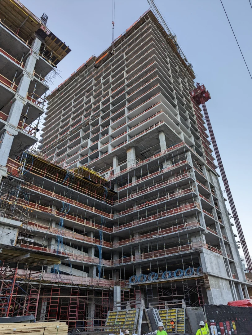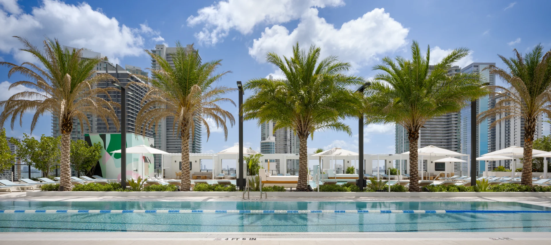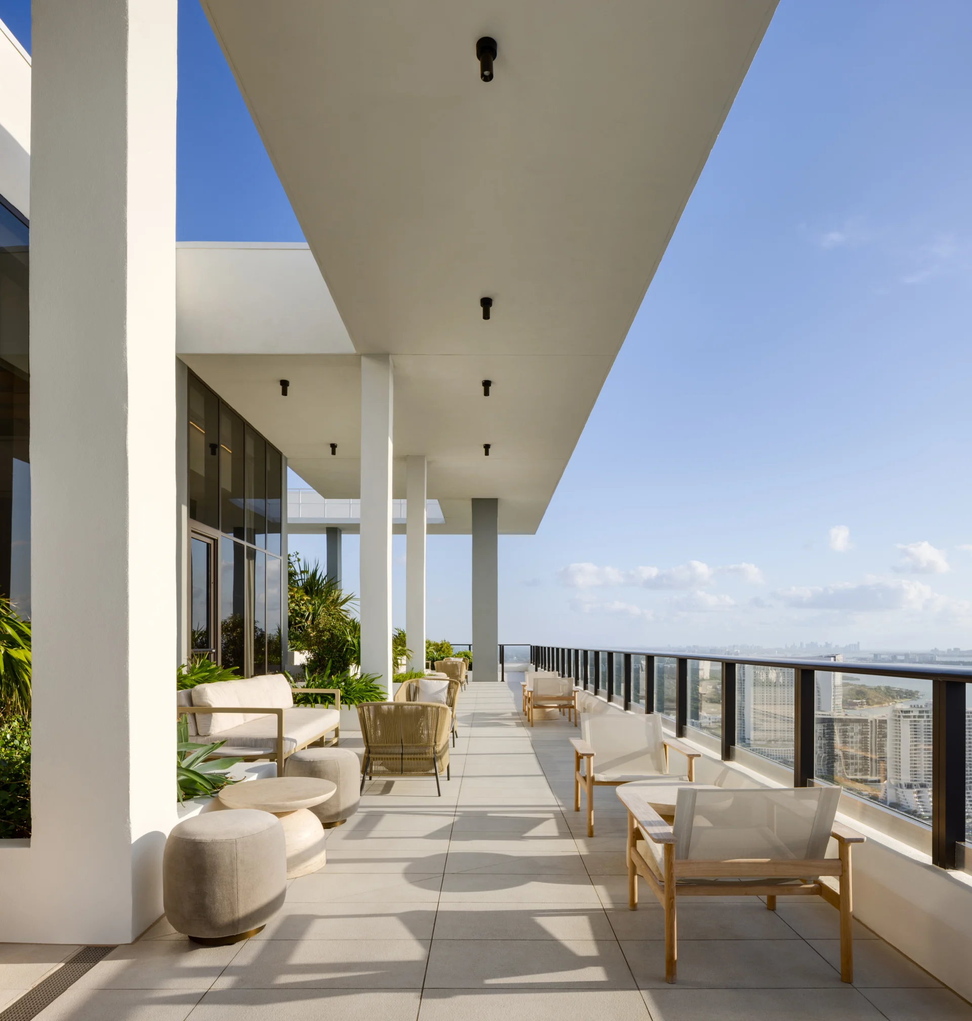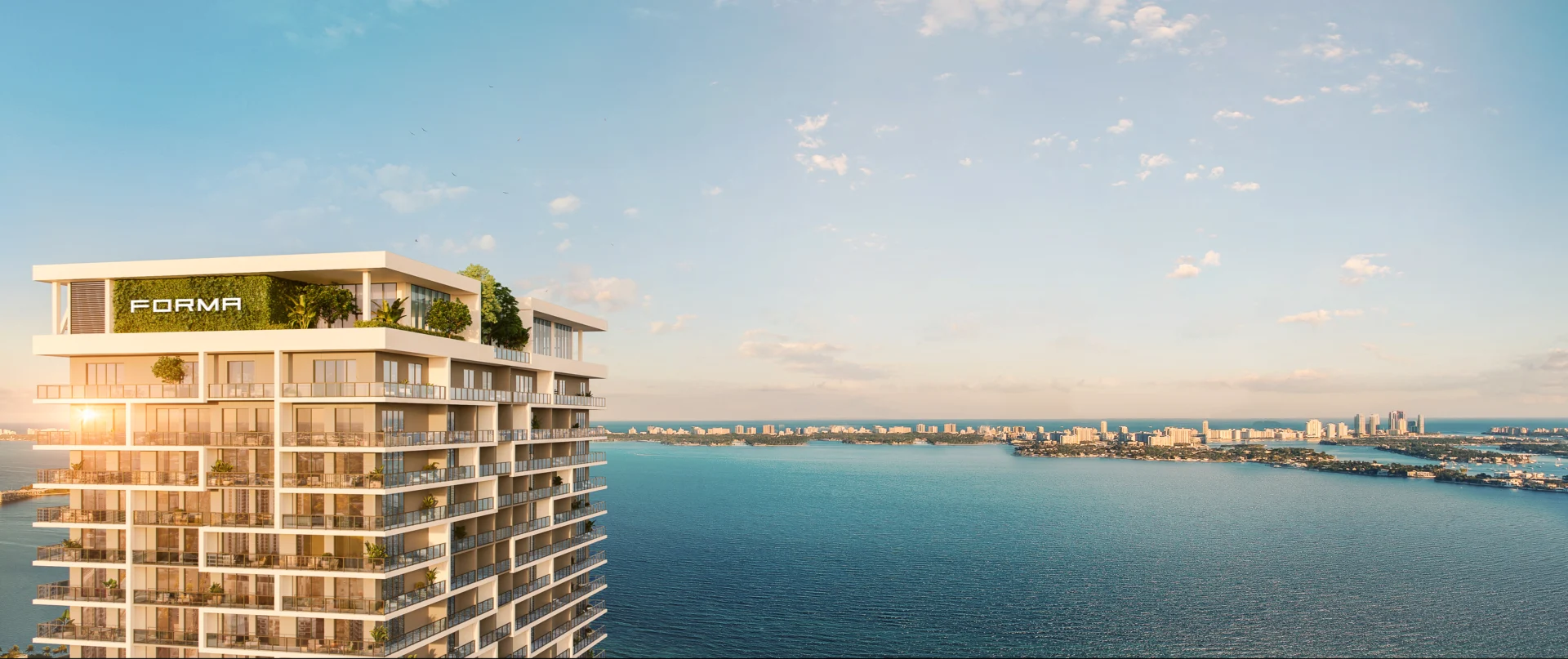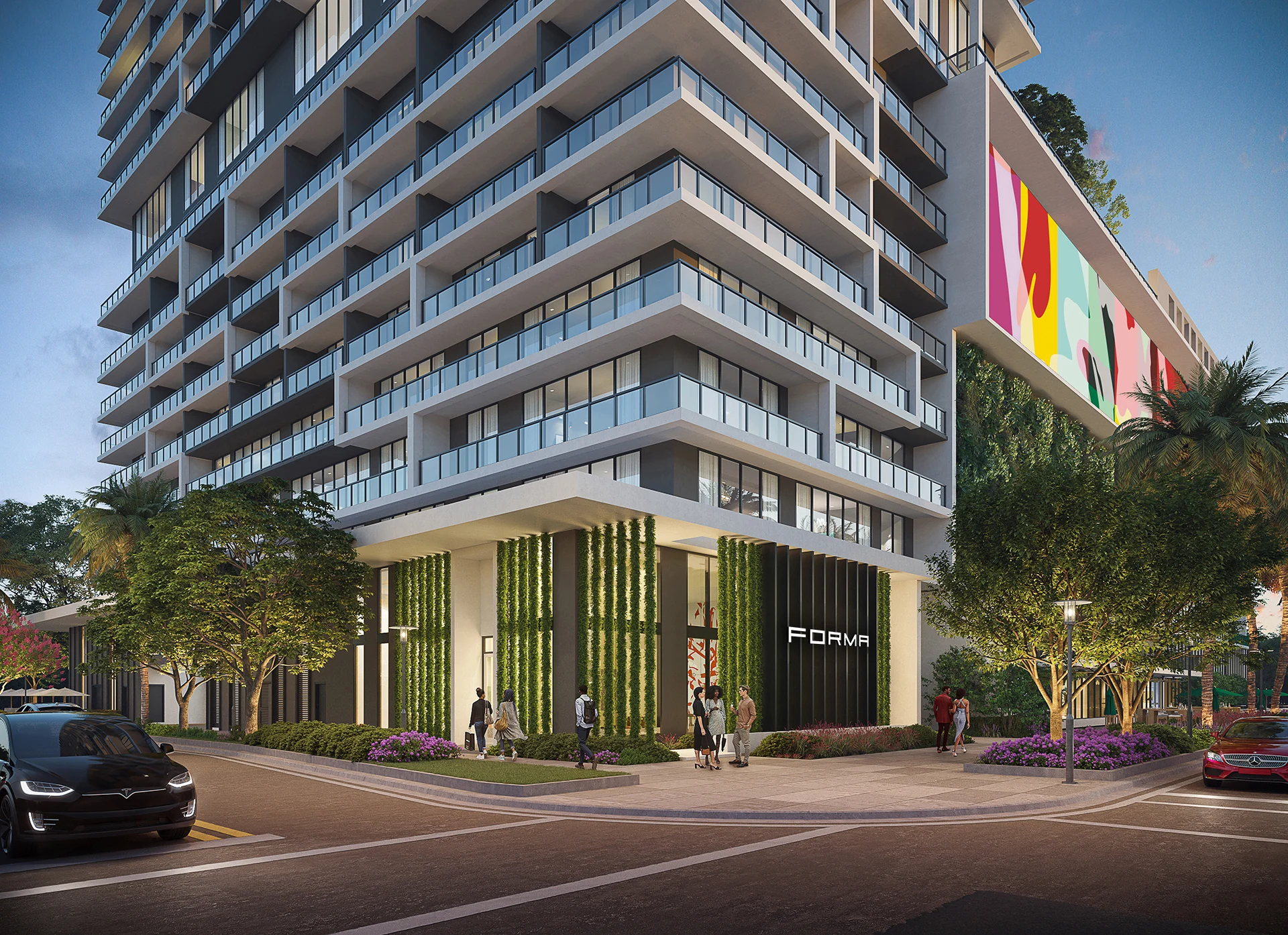 Forma is a 39-story residential tower which rises 428 feet with strong rectilinear massing, continuous glass balcony bands, and painted slab edges that create a dynamic visual rhythm. A 9,350-square-foot mural by Arturo Herrera animates the parking podium façade. The building includes 588 units, 50,812 square feet of retail, and an 85,000-square-foot amenity program—topped by Skyline and Sunset Terraces offering panoramic city and bay views.
