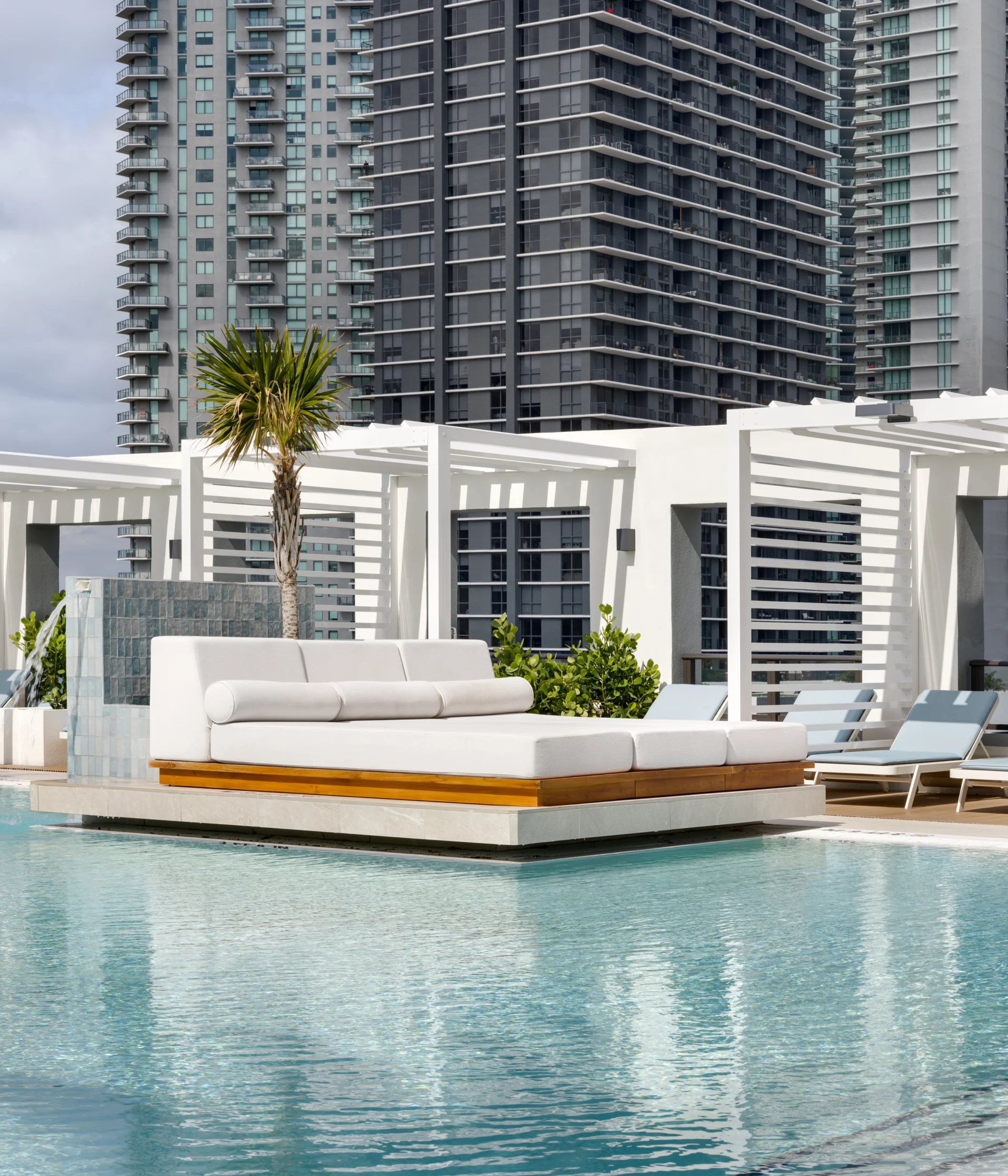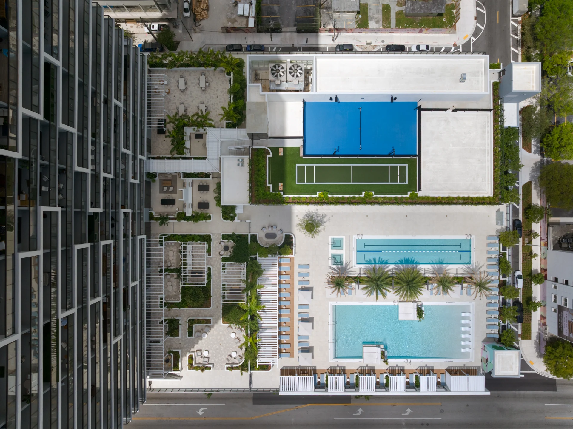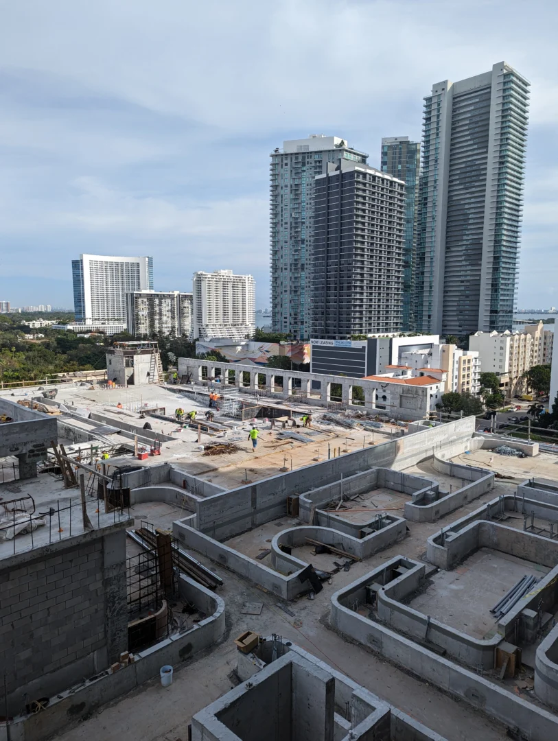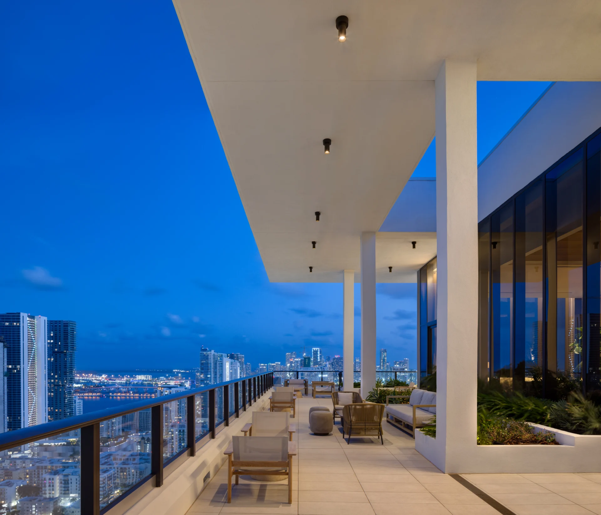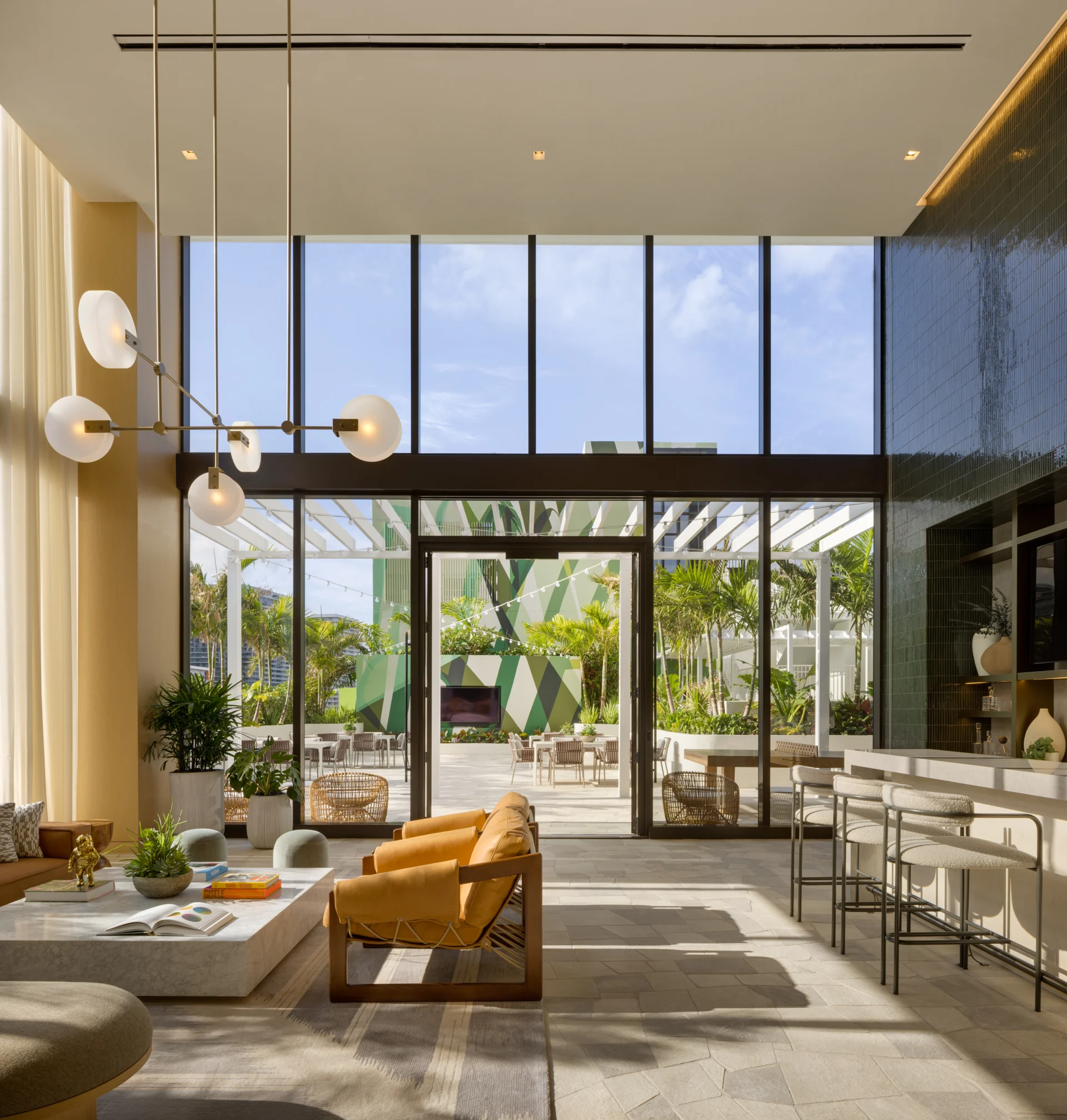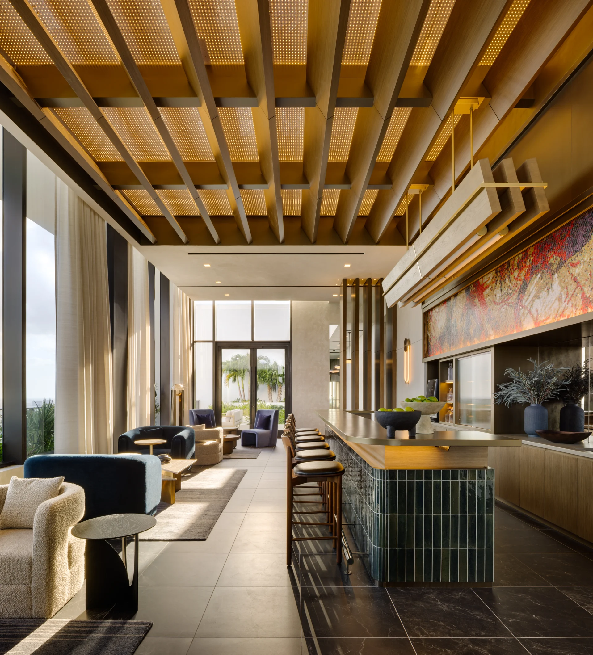 Forma is a 39-story residential tower which rises 428 feet with strong rectilinear massing, continuous glass balcony bands, and painted slab edges that create a dynamic visual rhythm. A 9,350-square-foot mural by Arturo Herrera animates the parking podium façade. The building includes 588 units, 50,812 square feet of retail, and an 85,000-square-foot amenity program—topped by Skyline and Sunset Terraces offering panoramic city and bay views.
