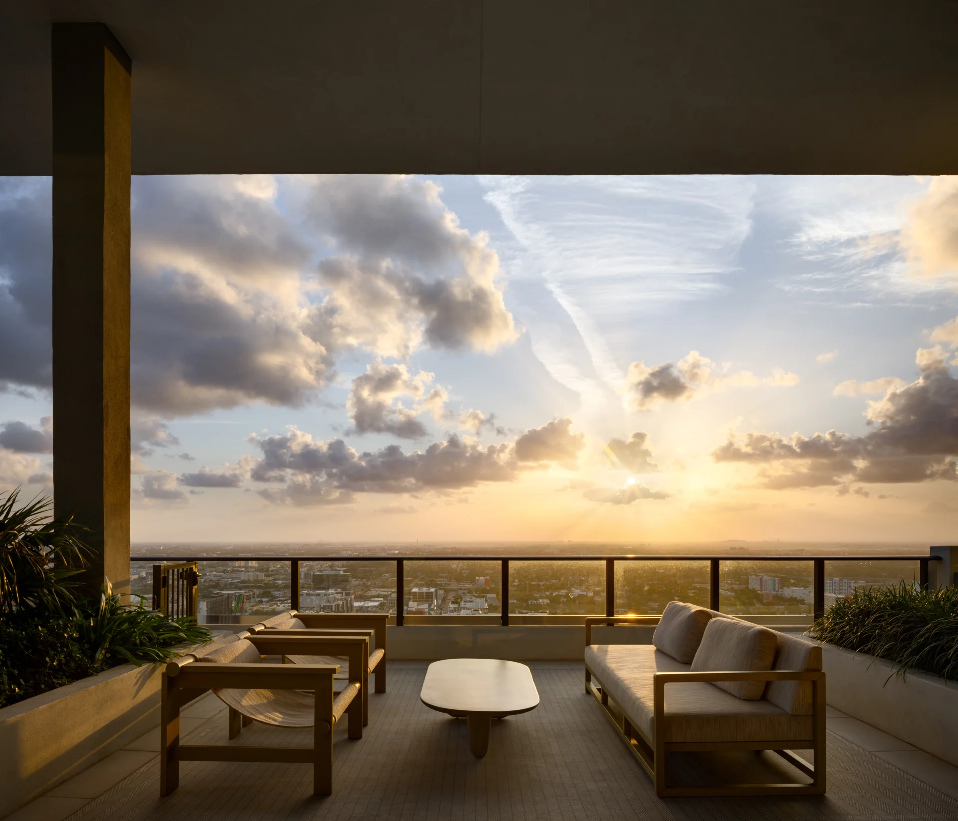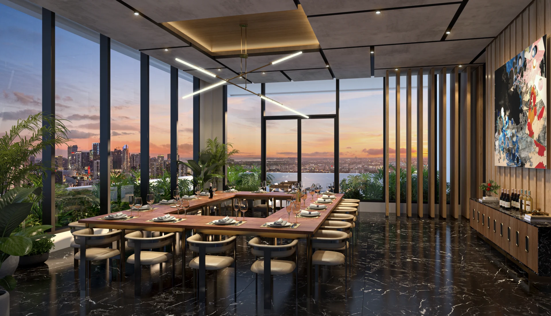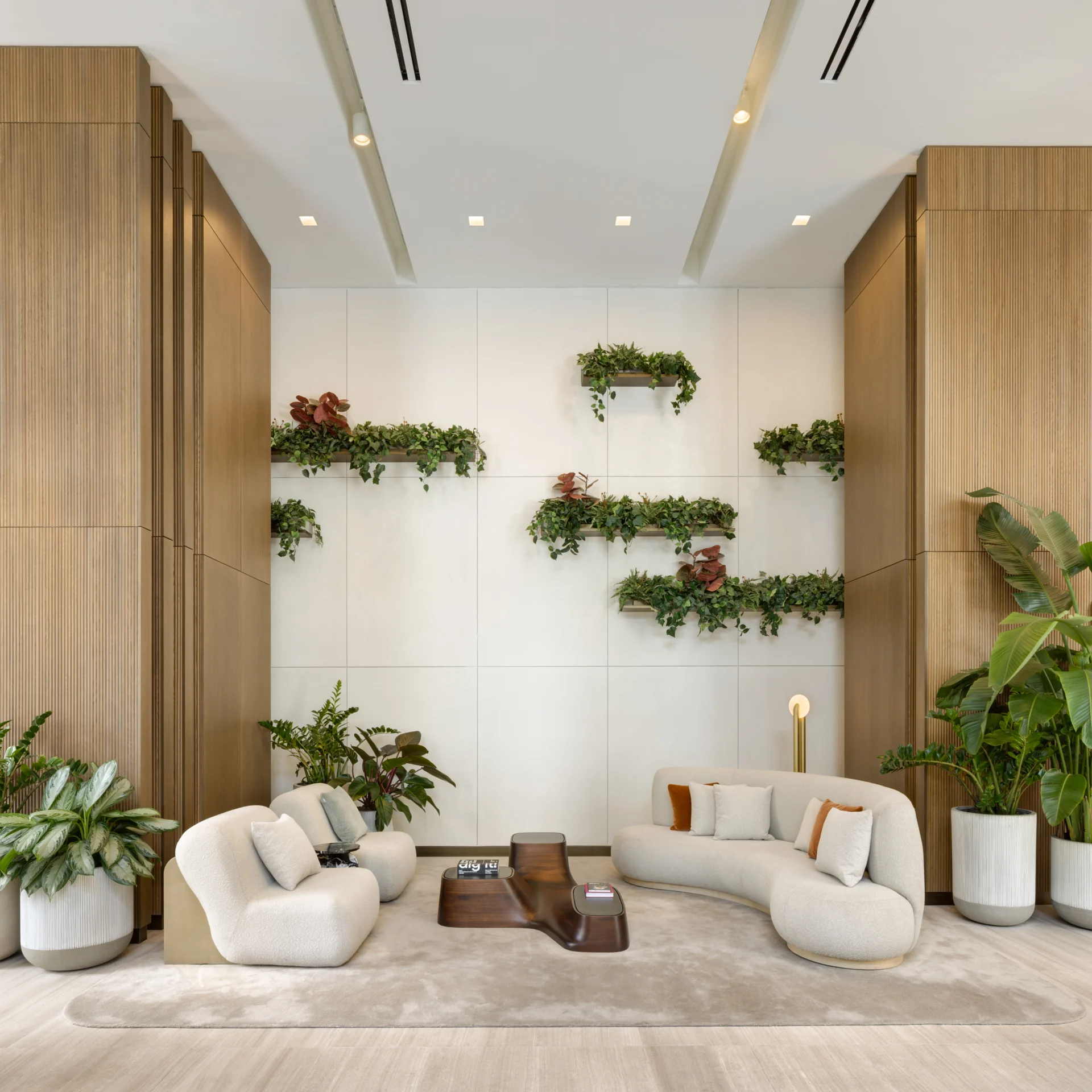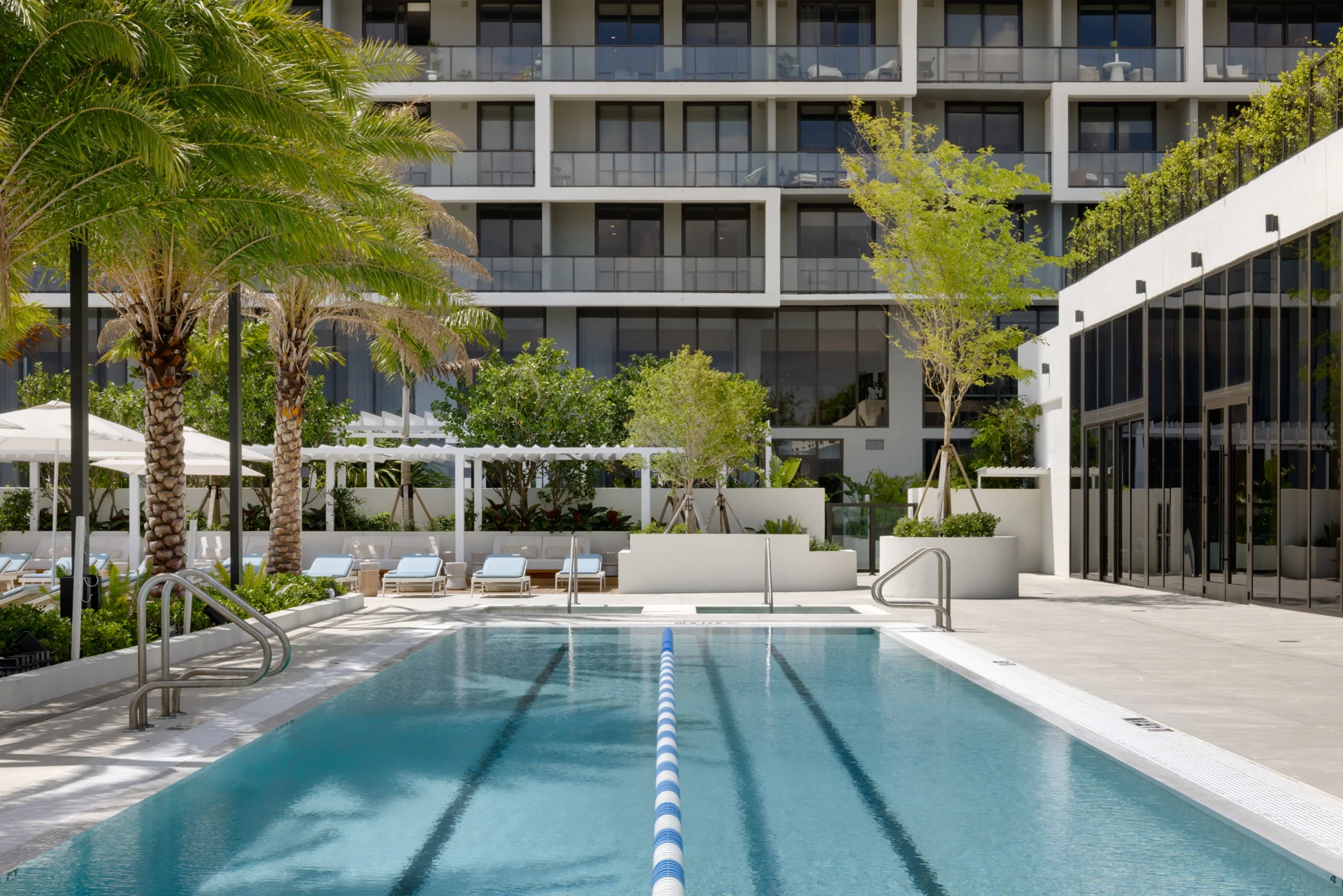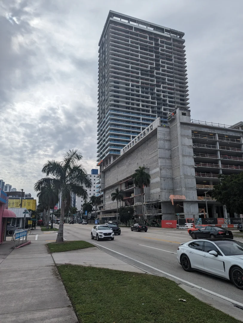 Forma is a 39-story residential tower which rises 428 feet with strong rectilinear massing, continuous glass balcony bands, and painted slab edges that create a dynamic visual rhythm. A 9,350-square-foot mural by Arturo Herrera animates the parking podium façade. The building includes 588 units, 50,812 square feet of retail, and an 85,000-square-foot amenity program—topped by Skyline and Sunset Terraces offering panoramic city and bay views.