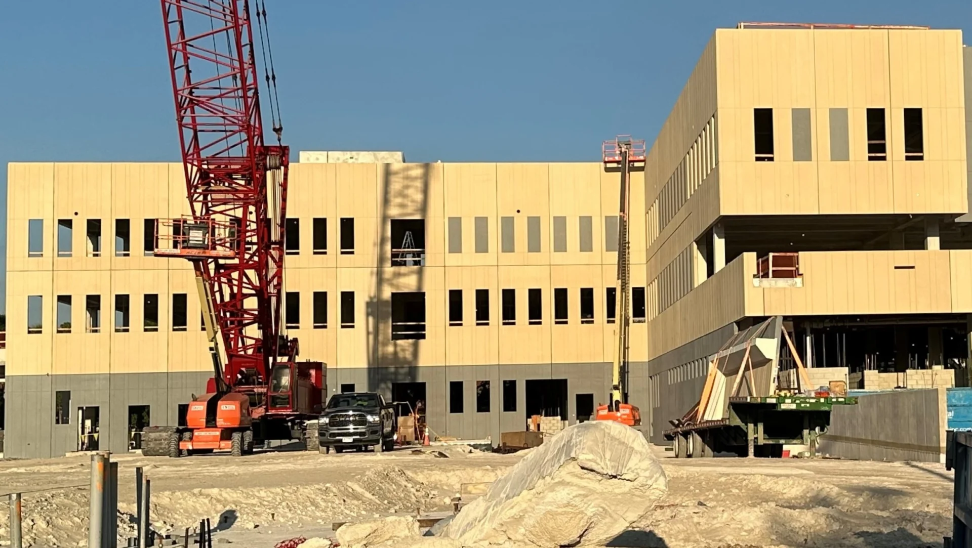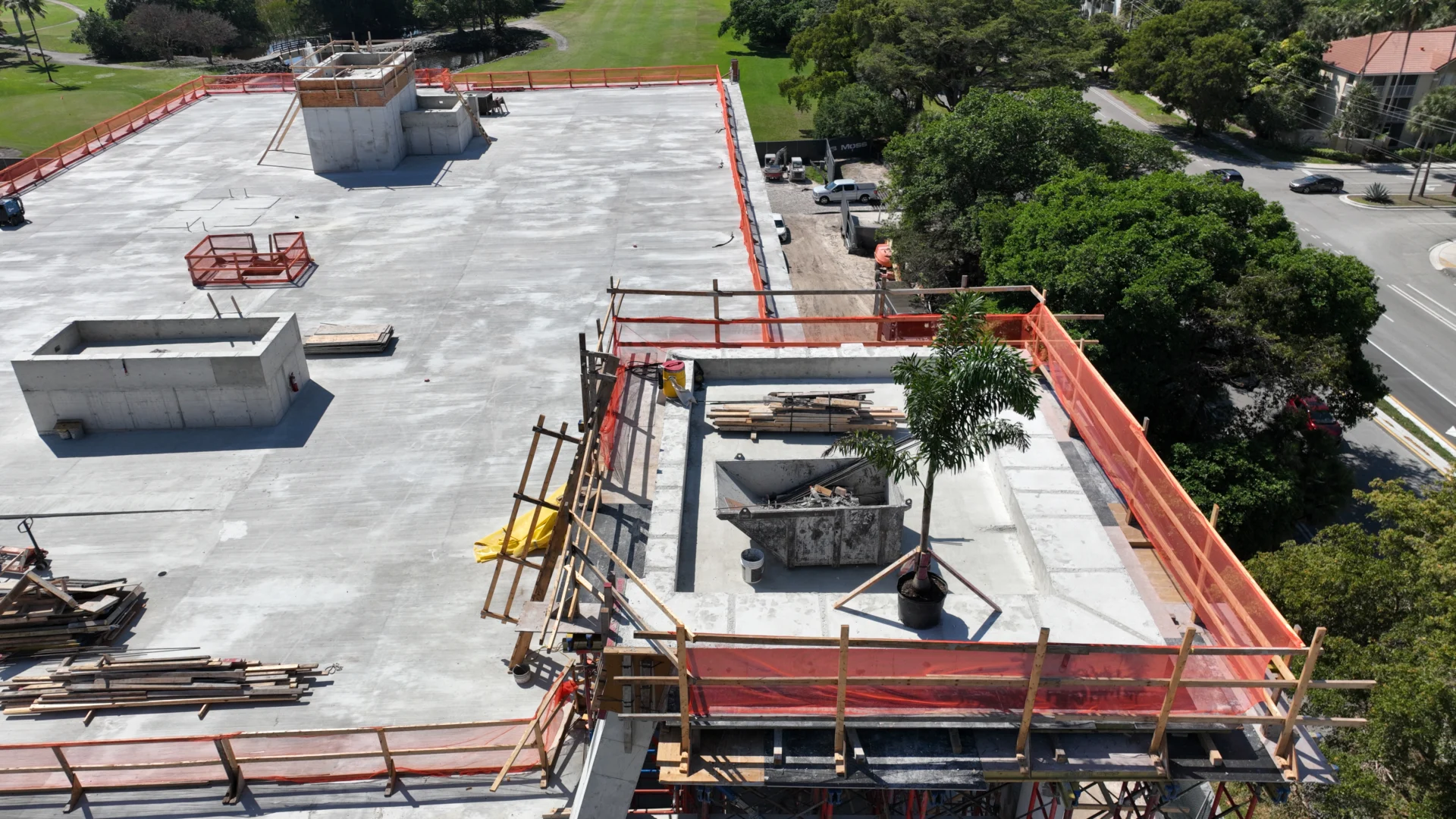 The new City of Hollywood Police Headquarters is currently under construction on City-owned land just south of the existing facility, replacing the former golf driving range and parking area. The existing headquarters will remain fully operational throughout the build. Spanning approximately 100,000 square feet, the new complex will feature a modern police building with structured parking for 350–450 vehicles, dedicated large-vehicle storage, and comprehensive facilities for training, holding cells, and administration. The site plan also includes a new golf clubhouse and driving range, to be built separately, as well as a dedicated police memorial