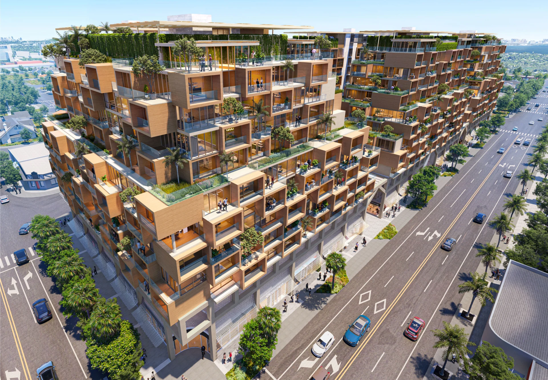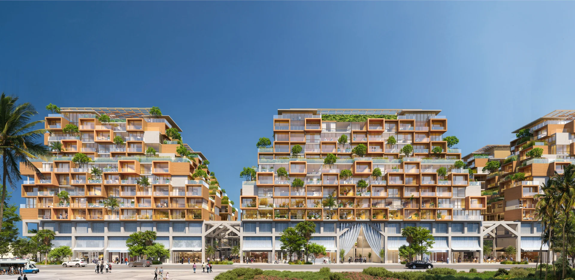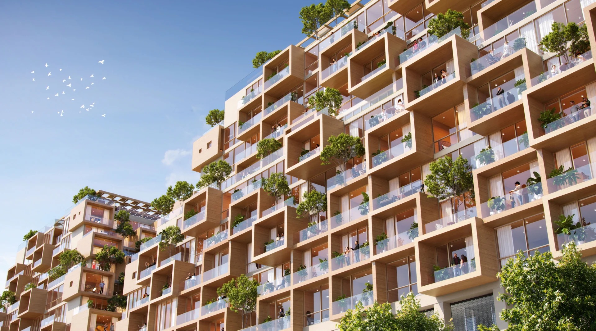 The residences are arranged across six thoughtfully articulated buildings, characterized by generous terraces, a dynamic interplay of concrete and wood, and elevated planters that enhance the connection between indoor and outdoor spaces.