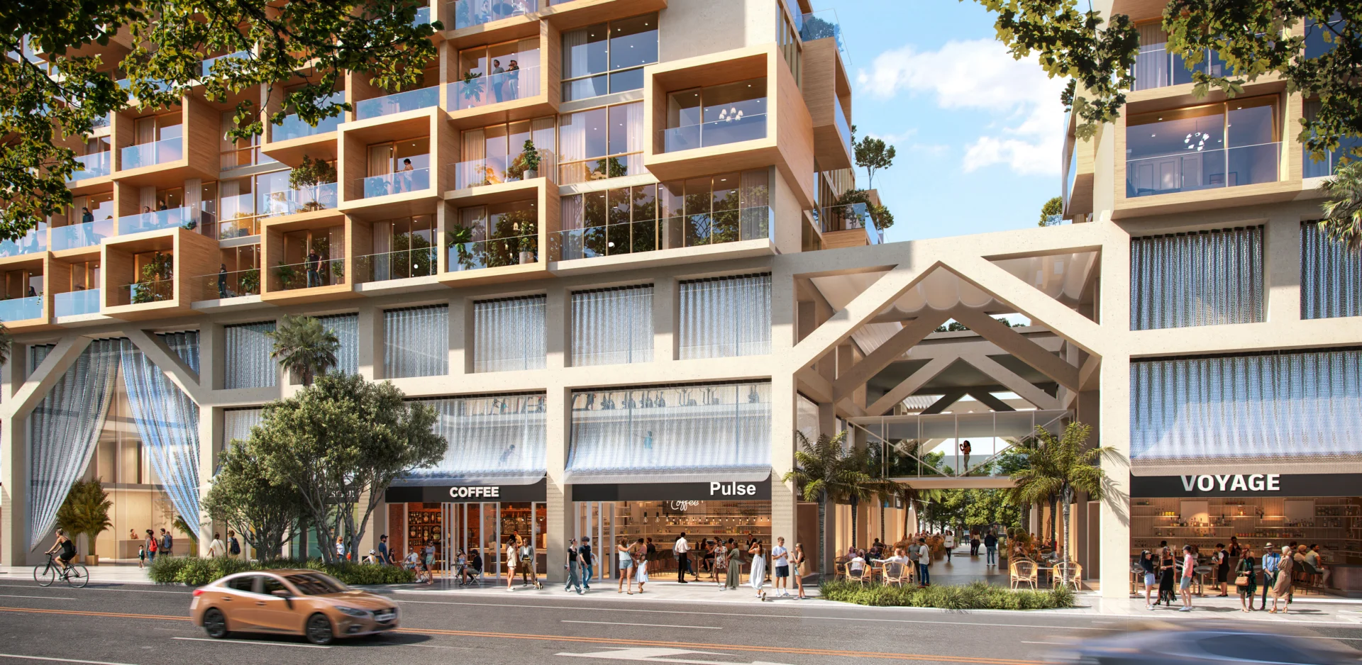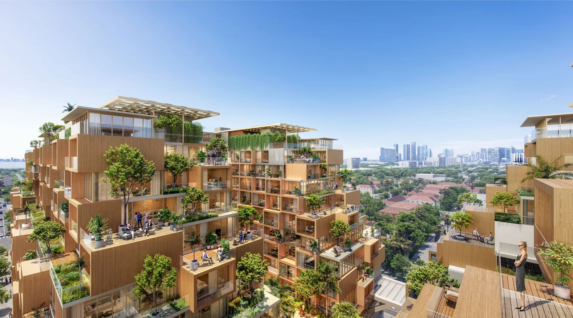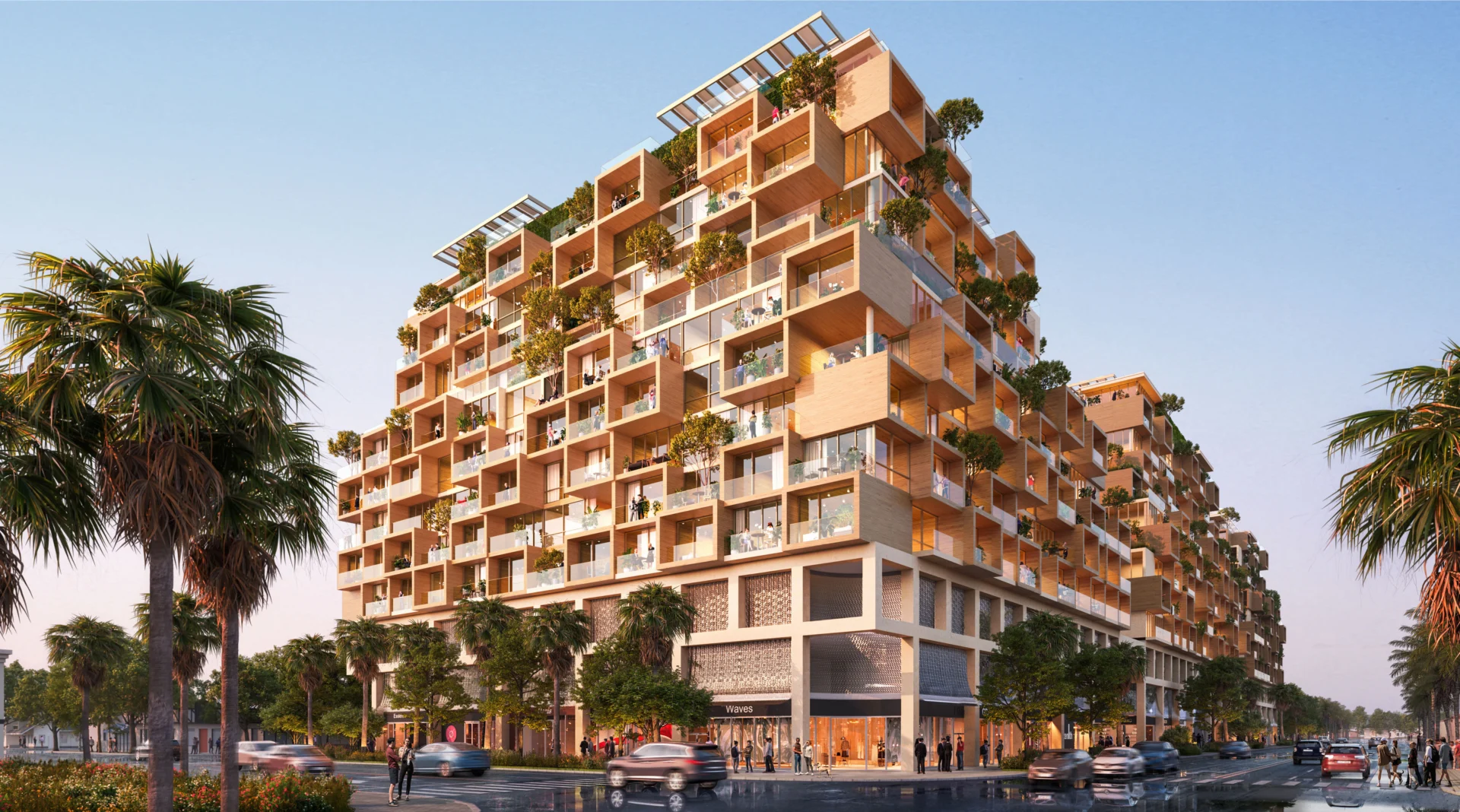 The residences are arranged across six thoughtfully articulated buildings, characterized by generous terraces, a dynamic interplay of concrete and wood, and elevated planters that enhance the connection between indoor and outdoor spaces.