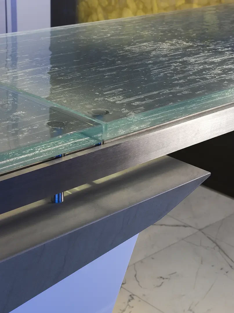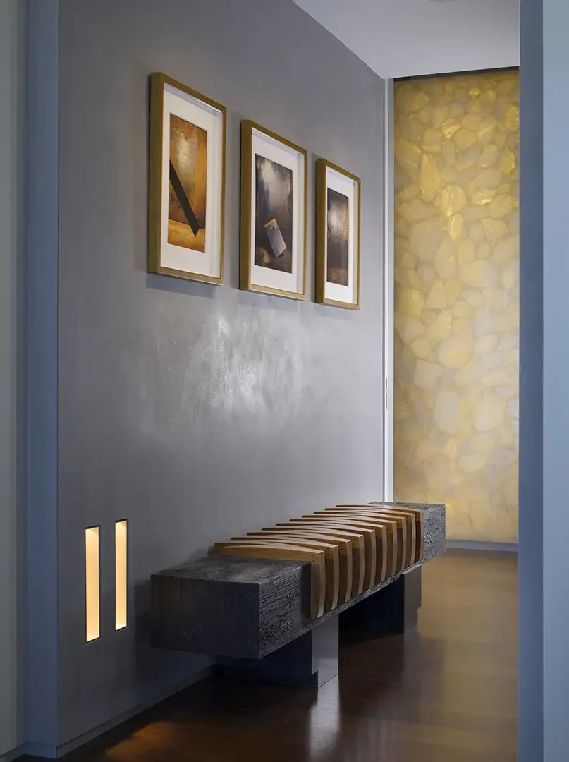 To create an open yet defined space, our firm reconfigured this 2,200-sq.-ft. condo for empty nesters and art lovers, using ceiling details and a 30’ backlit quartzite wall to guide flow. Gray textures and Ipe floors set the stage for ocean views and bold art. A custom sink modeled after the owner’s engagement ring adds personal flair, while sculptural elements throughout offer elegance, function, and meaning.