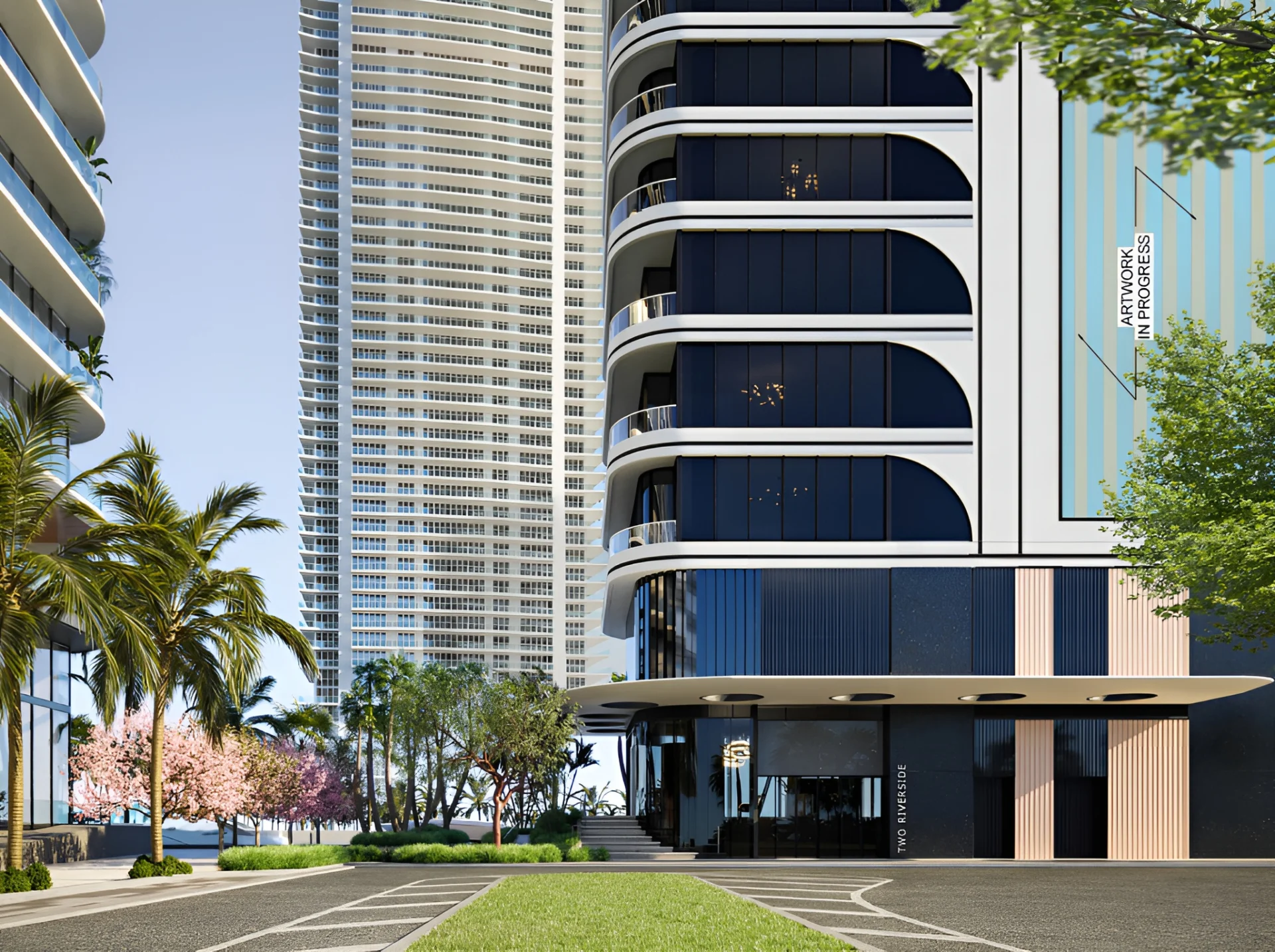 Two Riverside is a planned super-tall residential tower along the Miami River in Brickell. The project enhances the neighborhood’s public realm by extending the Miami Riverwalk across the site and linking it with the Underline linear park, creating continuous pedestrian connections and two landscaped plazas at each end.